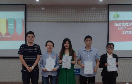 首先,学院研究生会主席李顾杰对上年度研究生会工作进行总结汇报,总结学习经验,指出工作问题,并对新一年的研究生会工作提出期望。随后张鹏飞、孙权、贺子婕老师分别为经管学院研究生会主席团成员、各部部长以及部委颁发2017-2018学年研究生会任职聘书,并合影留念。