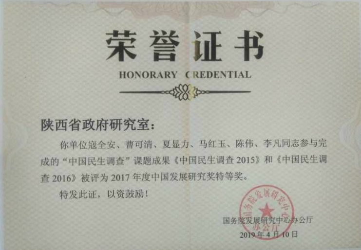 近日,从国务院发展研究中心办公厅获悉,bat365官网夏显力教授、马红玉副教授和陈伟副教授与陕西省政府研究室联合参与完成的“中国民生调查”课题成果《中国民生调查2015》和《中国民生调查2016》获得2017年度中国发展研究奖特等奖。