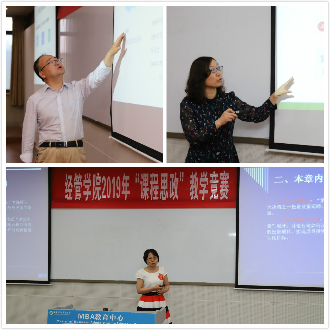 随后七名参赛选手陆续登场,分别从任教的课程内容出发,将“思政元素引入课堂”,突出以社会主义核心价值观为引领,以理想信念教育为核心。营销教研室教师王谊讲授“产品经理”这一知识点,以“如何移动富士山”这一问题入手,授课注重将理想教育(职业理想和社会理想)和爱国主义教育(将民族自豪感与危机感)相结合。讲解内容由浅入深,通俗易懂,润物无声式地将家国情怀及理想教育渗透其中;农经教研室教师马红玉以“农业经济学”中人力资本方面的知识作为授课内容,将深奥的专业知识贯穿在励志短片中,引导并培养学生在乡村振兴背景下投身农村、服务三农的情怀,引起阵阵掌声;工商教研室新进教师邱璐通过对企业宏观环境案例分析,激发学生对现代企业发展的关注,让学生意识到团队合作与交流在科学研究中的重要性,能够主动地获取除专业知识外的新知识和新能力,提高自身思想文化素质。各位参赛选手在比赛中或互动热烈、或神采飞扬、或诙谐幽默,各具特色,一堂堂课程精彩纷呈,获得了评委和学生的一致好评。