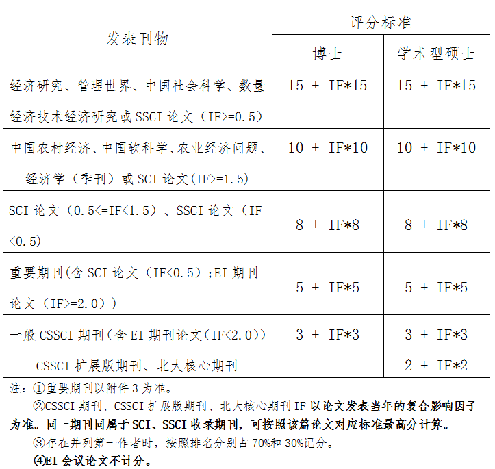 发表论文必须满足研究生在读期间发表,并且本人为第一作者,导师为通讯作者(有些期刊不标注通讯作者时,共同作者中需要有导师),西北农林科技大学为第一署名单位;若符合其它条件(第一作者、第一署名单位)但论文中无导师者,按照该篇论文计算总分乘以0.6的系数核算。其中,北大核心和CSSCI论文以录用通知、收费证据(需导师签字审核确认)或期刊原件为准,三大检索论文(SSCI、SCI、EI)以录用通知或论文原件为准。上一年度已经参与学业奖学金评定的论文成果不允许二次使用,一经发现,直接降为三等。期刊等级及影响因子以论文录用或见刊当年为准。具体评分标准如下: